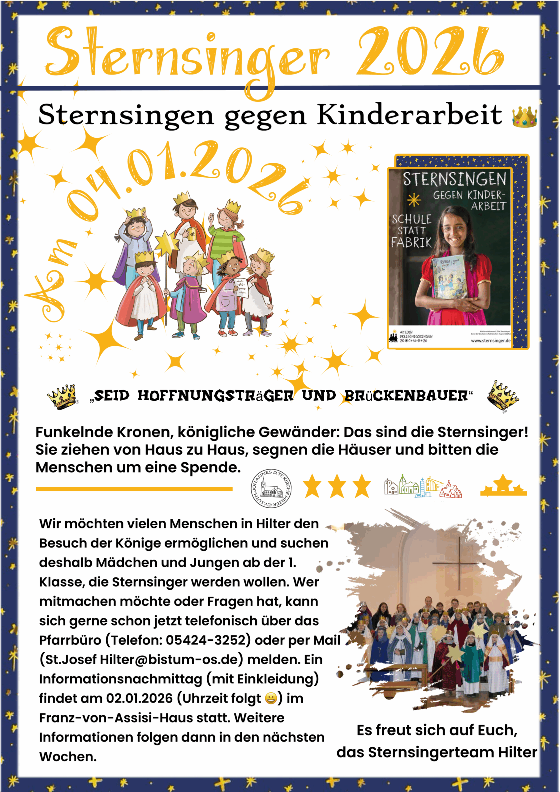 Hilter: Schule statt Fabrik – Sternsingen gegen Kinderarbeit: Wir suchen DICH! Funkelnde Kronen, königliche Gewänder: Das sind die Sternsinger! Sie ziehen von Haus zu Haus, segnen die Häuser und bitten die Menschen um eine Spende. Wir möchten am 04.01.2026 wieder vielen Menschen in Hilter den Besuch der Könige ermöglichen und suchen deshalb Mädchen und Jungen ab der 1. Klasse, die Sternsinger werden wollen. Wer mitmachen möchte oder Fragen hat, kann sich gerne schon jetzt telefonisch über das Pfarrbüro (Telefon: 05424-3252) melden oder per Mail (St.Josef-Hilter@bistum-os.de) mit uns Kontakt aufnehmen. Weitere Informationen folgen dann in den nächsten Wochen.